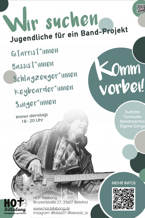 Zusammen mit erfahrenen Bandcoaches kannst du ab jetzt jeden Dienstag von 18 – 20 Uhr proben. Bei uns erhält du Tipps und Tricks zum gemeinsamen Musizieren. Wir bieten dir den Raum, um gemeinsam mit anderen Jugendlichen zu proben, im kleinen Rahmen ein Feedback zu bekommen, Demos aufzunehmen, Musikvideos zu drehen und dich auf gemeinsame Auftritte vorzubereiten. Die Teilnehmer*innen des Band-Projektes erhalten die Möglichkeit bei unserer Jugendkulturbühne LAKESIDE (Instagram) und diversen anderen Bühnen aufzutreten.
